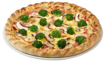 Tomatensauce, Putenschinken, Champignons, Broccoli und Käse